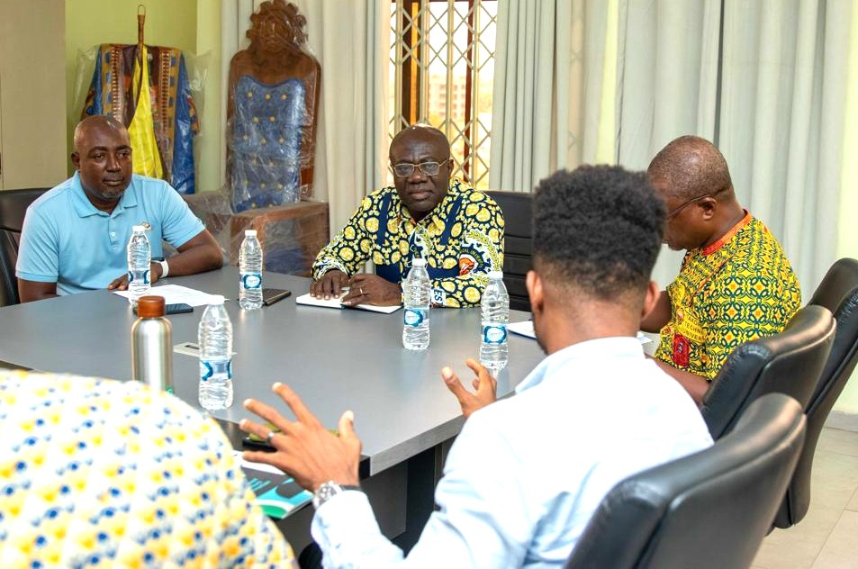 Officials from E4Impact Foundation during field visit briefs TTU VC, Rev. Prof. Joh Frank Eshun(middle), Pro VC, Prof. Victor Kweku Bondzie Micah (far left) and Registrar, Dr. Moses Maclean Abnory (far right)